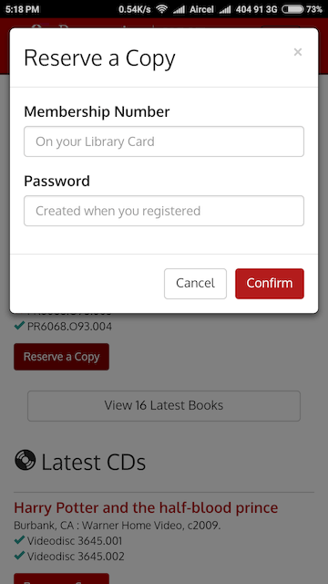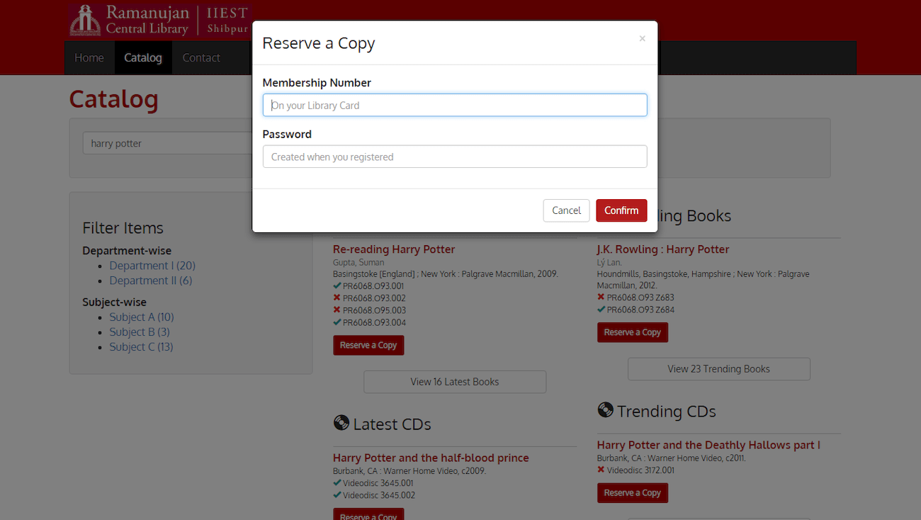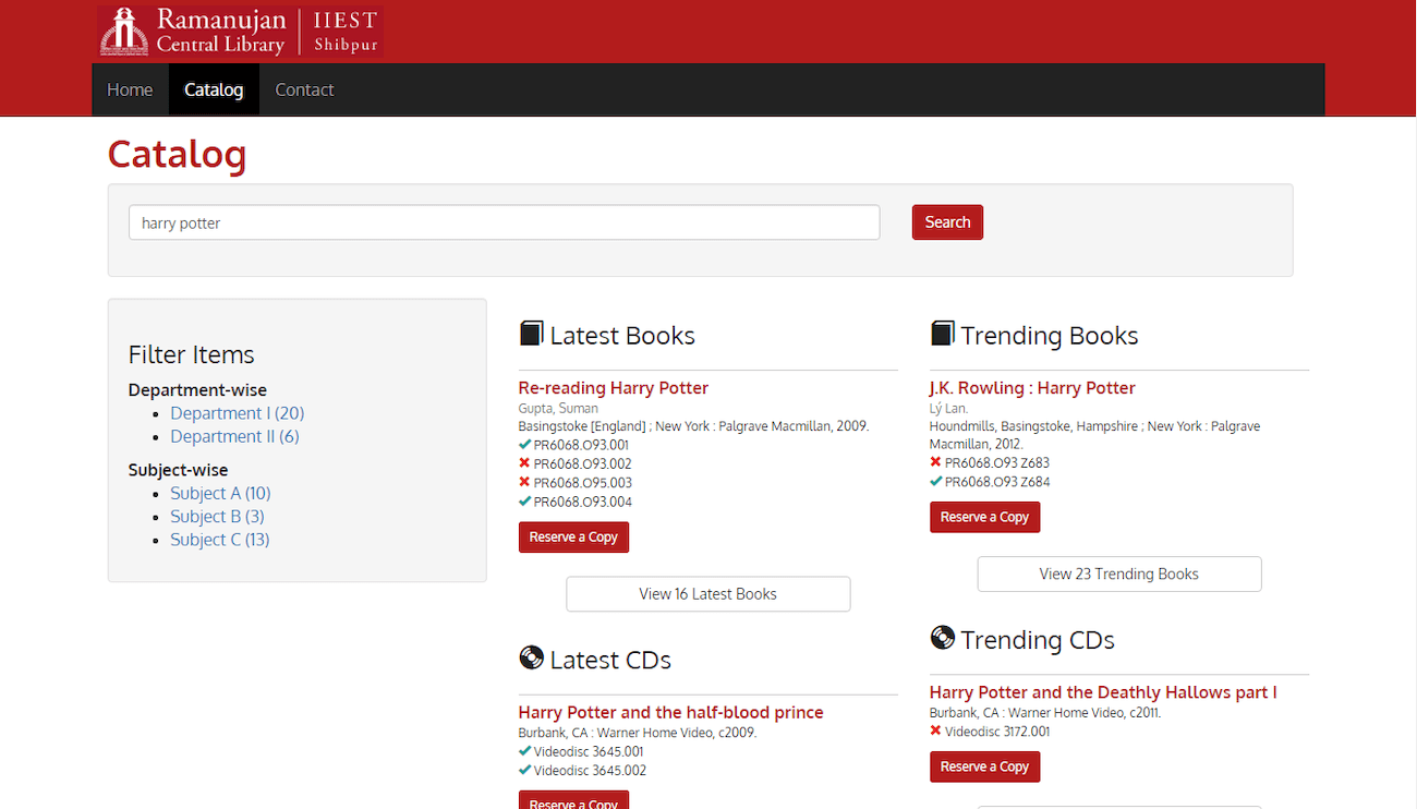 - Catalog page shows books / CDs available, with facility to group, search and sort books.